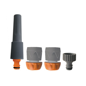 Description KIT ARROSAGE - 1 nez de robinet double fi letage - 2 raccords 19 mm dont 1 avec aquastop - 1 lance d'arrosage